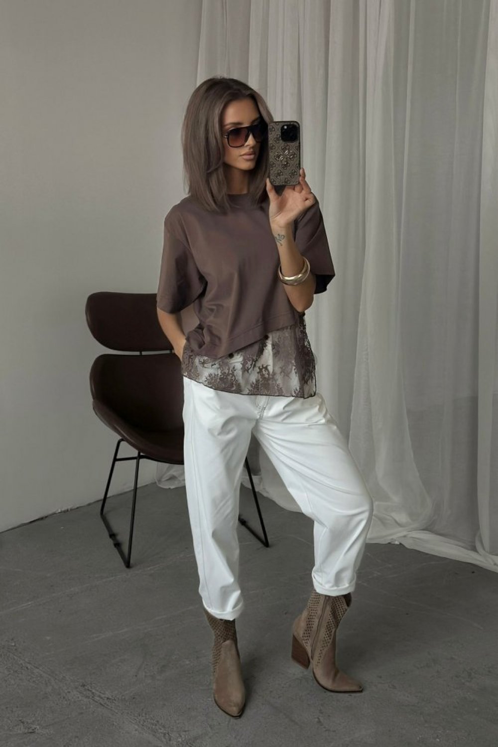 T-shirt z koronką DANNA brązowy